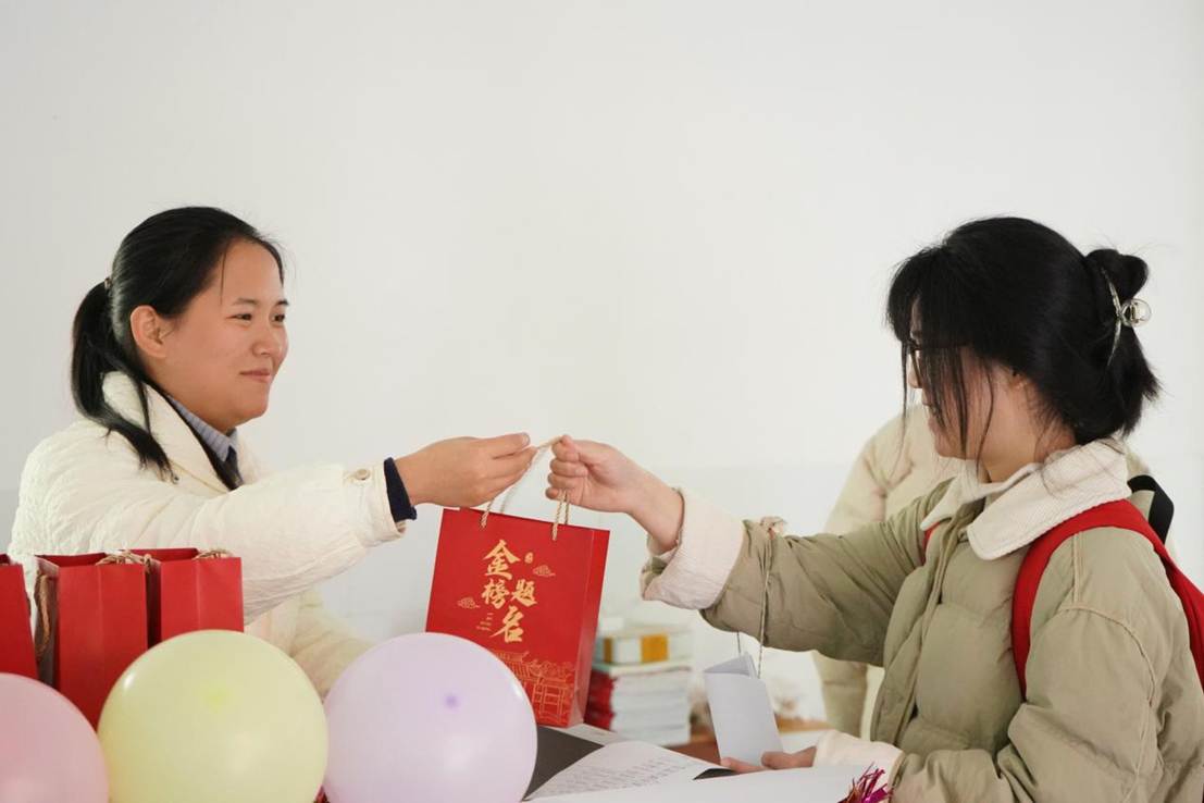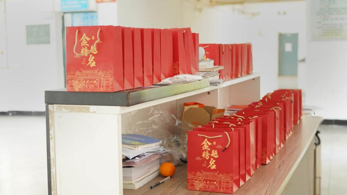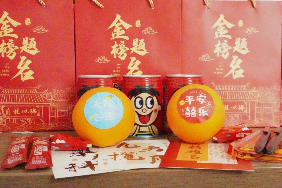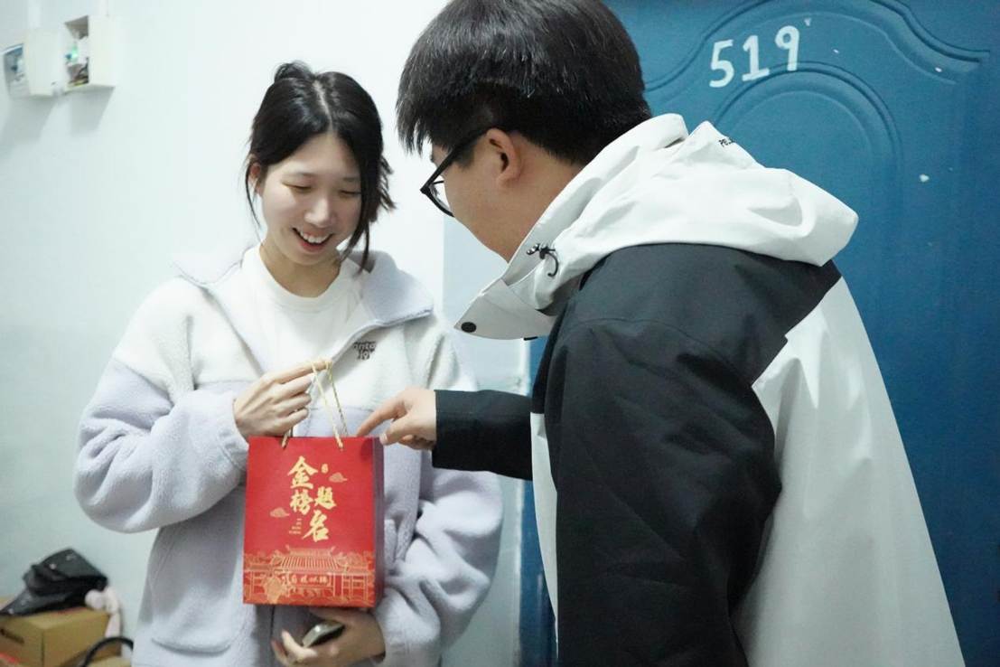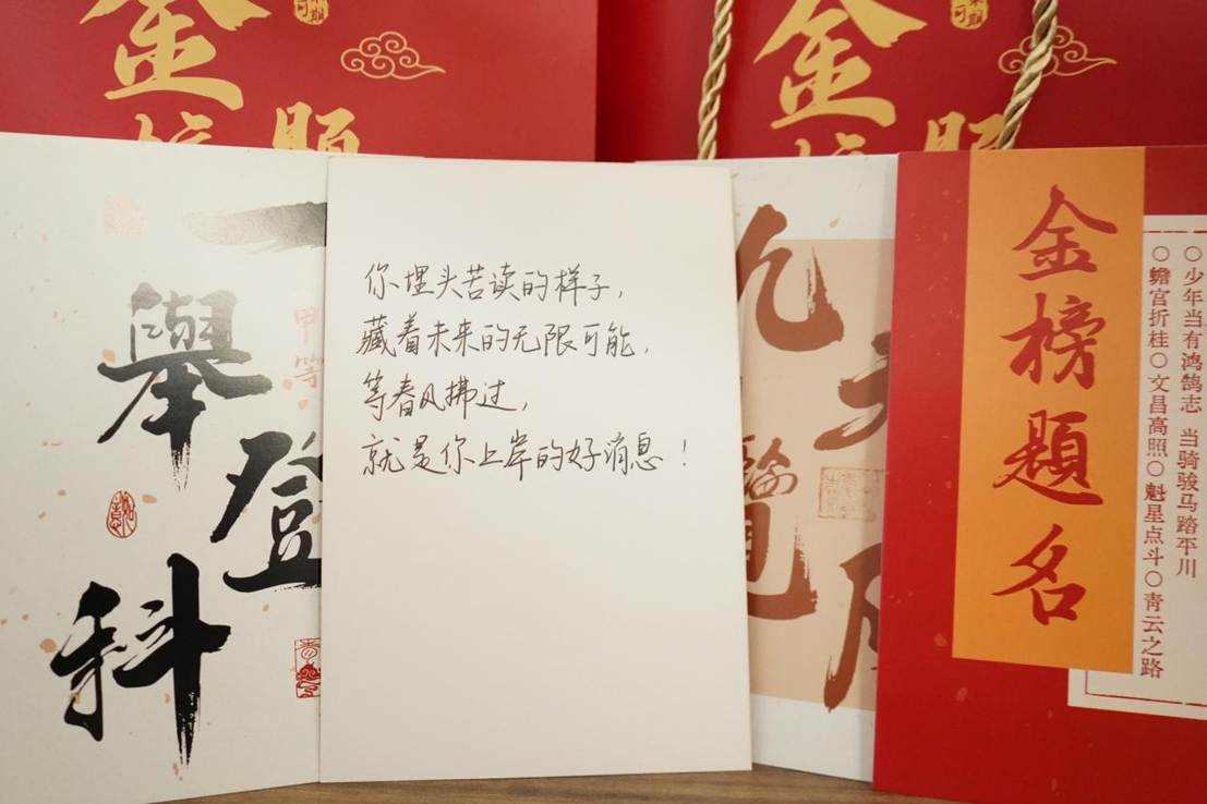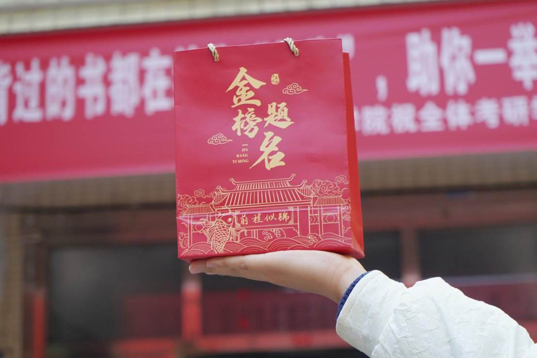 同时,学院还为每一位考研学子精心准备了“考研冲刺加油包”,祝愿考研学子能够一战成硕,金榜题名。学弟学妹们为物资贴上暖心的标签,细心地将其装袋:寓意“考研成功”的橙子,是对上岸的直接美好期许;旺仔牛奶的加持,考试运势必定旺!暖宝宝的暖心陪伴,消除了考试的孤独与疲惫,带来了慰藉和底气。这些细微的细节中,包含着大家对考研学长学姐的深情祝福和殷切期待。2022级辅导员刘志伟亲手为考研学子写上贺卡,平淡的言语中,饱含着老师对学生的最真切的关怀与期许,寄托着对未来前程的美好祝愿。