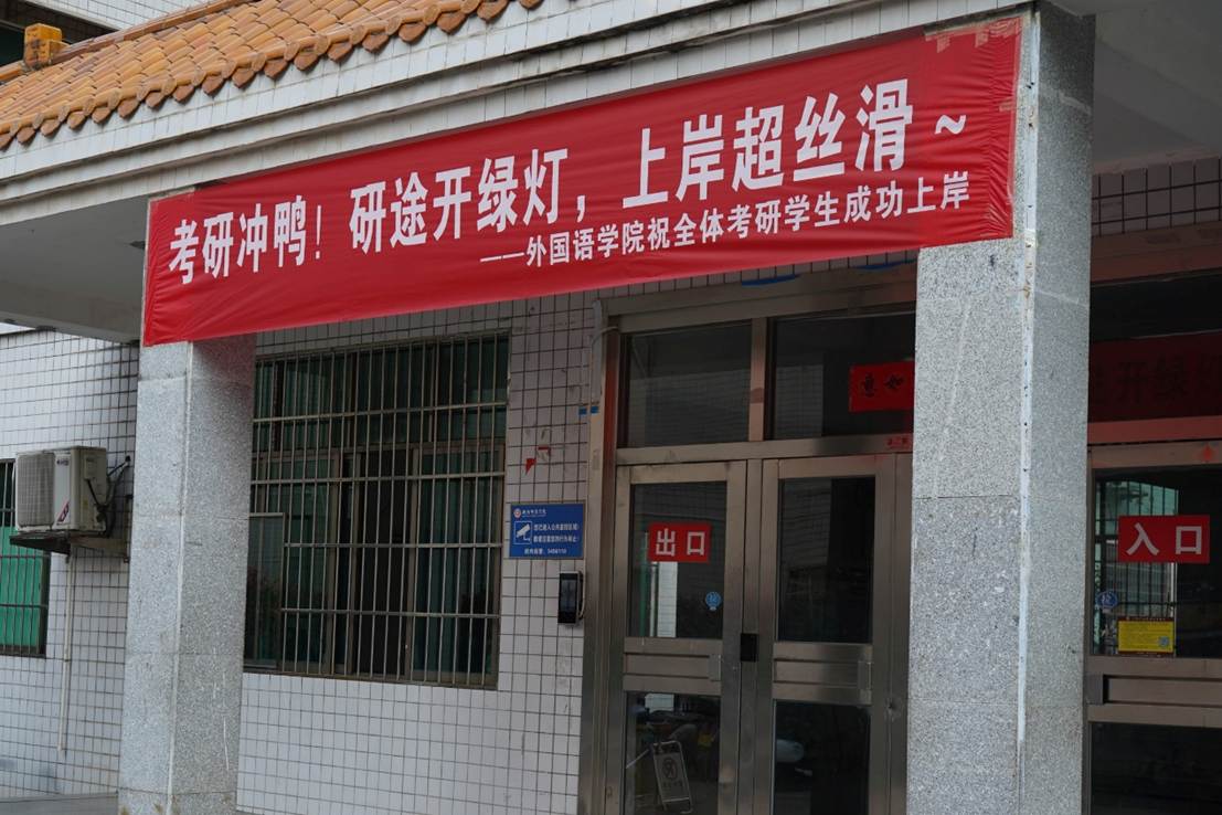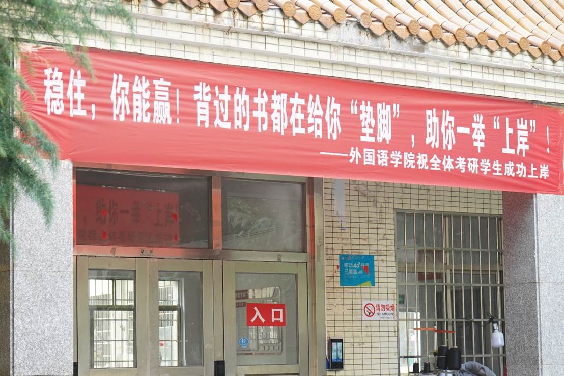 学院于四栋和十二栋学生公寓门口拉上了横幅。“考研冲鸭!沿途开绿灯,上岸超丝滑”“稳住,你能赢!背过的书都在给你垫脚,祝你一举上岸”,横幅上的每一句话都寄托的学院对各位考研学子的期望和信心。