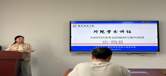 2026 年 4 月 27 日下午 3 时,谢彩虹教授应邀为我院教师和研究生开展题为《AI 时代外语专业的破局与重构思路》的专题讲座。本次讲座由何文娟教授主持,学院多名教师及 2024 级、2025 级研究生齐聚外语楼北 504 教室,到场聆听学习。