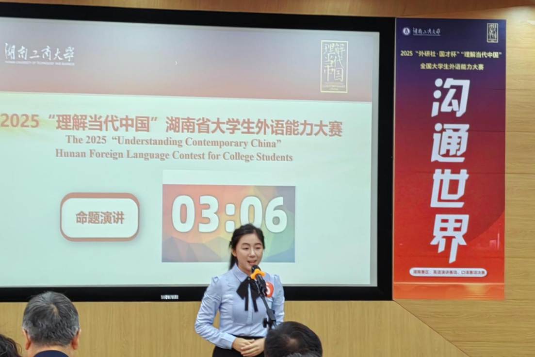 群雄逐鹿展风采,以赛育人谱新篇。2025 年10月24日至26日,由湖南省教育厅主办、湖南工商大学承办的“2025 年外研社・国才杯‘理解当代中国’湖南省大学生英语能力大赛” 成功举办。本次大赛以习近平新时代中国特色社会主义思想为指引,深入贯彻党的二十大精神,紧扣立德树人根本任务,着力推进“三进”工作走深走实,为高校外语教学改革提供实践支撑,为学子搭建语言实践与跨文化交流的优质平台,助力培养兼具家国情怀与国际视野的实战型外语人才。