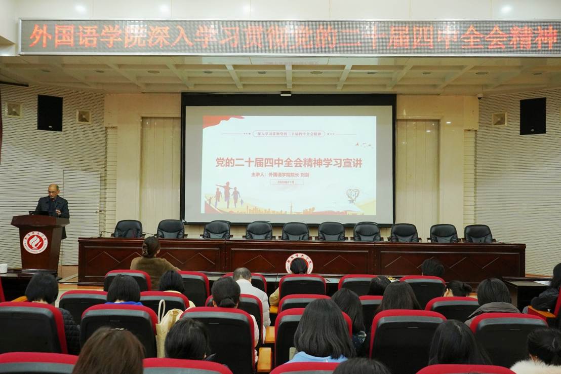 为进一步提升教师的政治素养与育人能力,深入学习贯彻党的二十届四中全会精神,11月24日下午15:00,外国语学院院长刘剑在外语楼北311开展《党的二十届四中全会精神学习宣讲》专题党课,全体教师党员到场认真听讲。