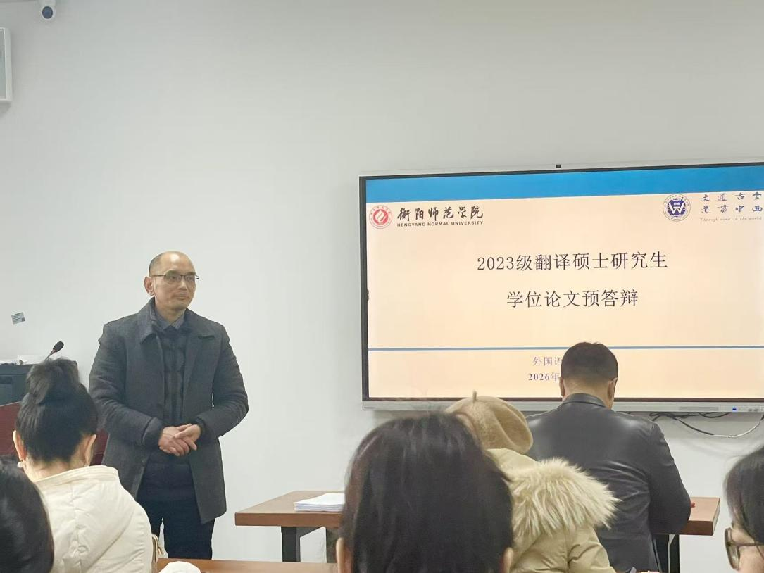 为进一步提升学位论文撰写质量,帮助2023级翻译硕士研究生高标准完成学业论文。2026年1月5日14:00,外国语学院在外语楼北504教室举行2023级翻译硕士研究生学位论文预答辩。